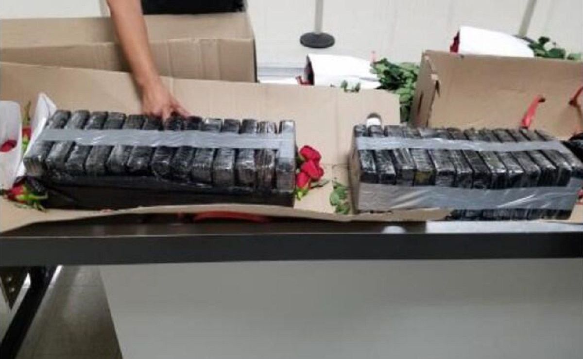 Alertados por canes, los oficiales revisaron el cargamento y se percatan de que las cajas contienen 26 bloques de cocaina y rosas a su alrededor.