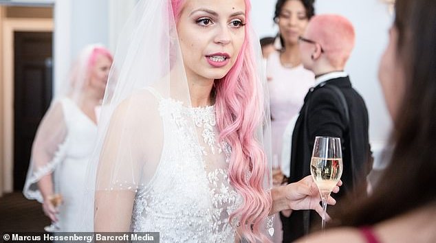 La ceremonia de boda se llevó a cabo en un hotel de 5 estrellas en Liverpool Street, en Londres, el pasado mes de junio 8. Las dos iban vestidas de blanco, con velo y se pintaron el cabello de color rosa brillante.