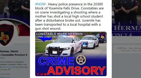 #NOW– Heavy police presence in the 20300 block of Yosemite Falls Drive. Constables are on scene investigating a shooting where a mother has shot a local high school student after a disturbance broke out. Juvenile has been transported to a local hospital with a gun shot wound. pic.twitter.com/q7Cbzs7Nn0