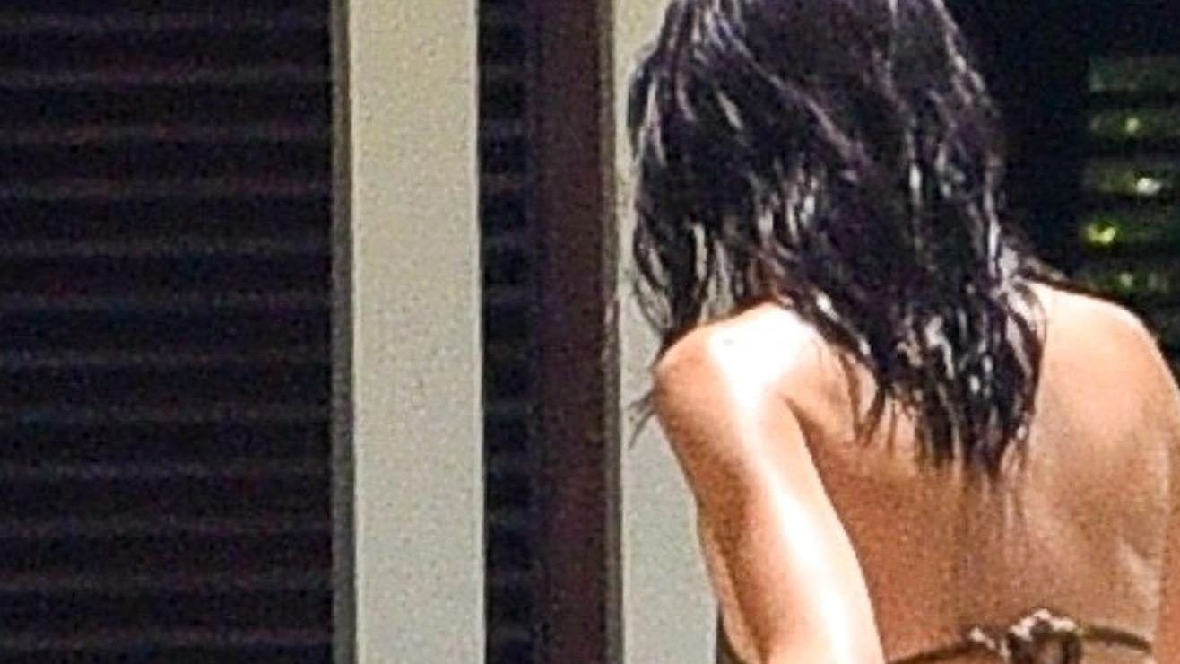 La modelo del clan Kardashian se lució con un minibikini café, mientras que la señora Bieber optó por un modelo floreado.
