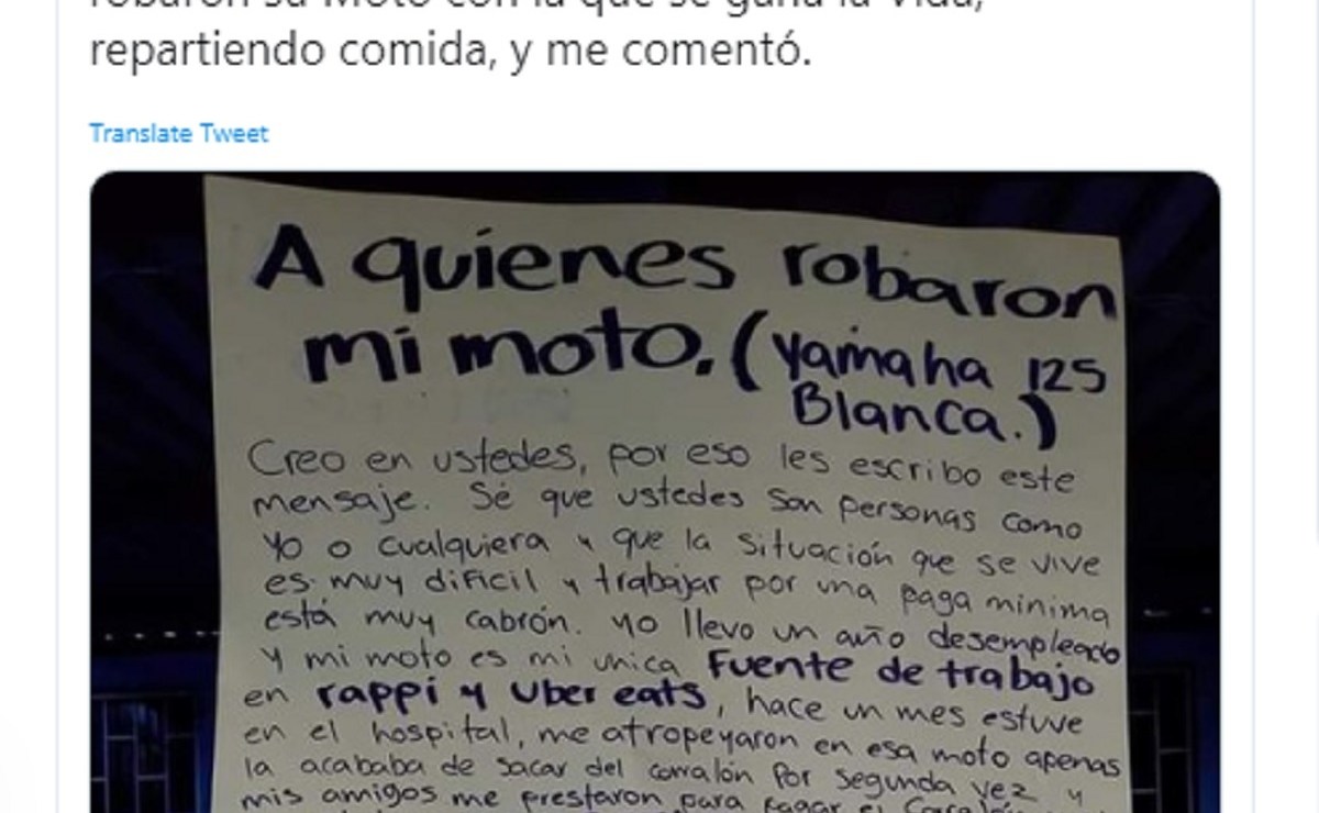 Conmovedor mensaje de repartidor de comida al que roban motocicleta se hace viral