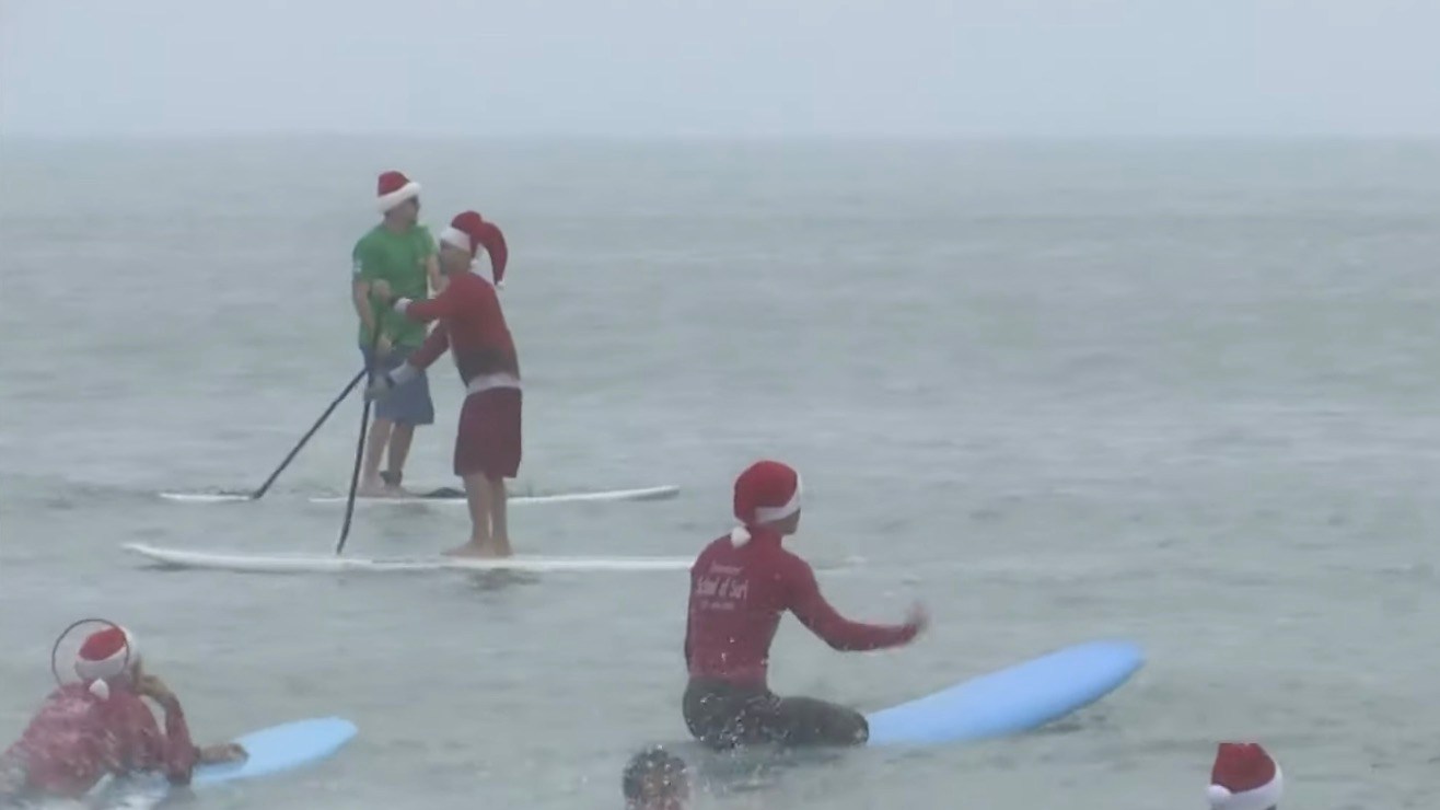 Unas 600 personas vestidas como Santa Claus surfean las costas de Florida para recaudar dinero
