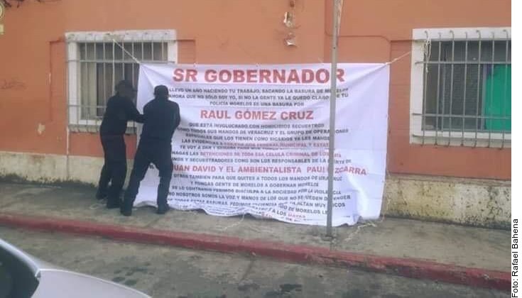 MÉXICO – Diversas mantas en las que se señala a supuestos extorsionadores y funcionarios ligados a la delincuencia, fueron colgadas en Cuernavaca, Morelos, por un grupo que portaba armas largas y vestía con equipo táctico, alertaron fuentes de la Comisión Estatal de Seguridad.