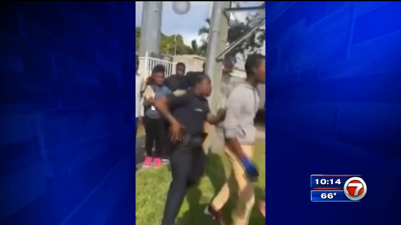 Se puede apreciar a dos policías de las Escuelas de Miami-Dade, pero es la mujer quién toma la delantera. En las imágenes se la ve deteniendo a un joven.