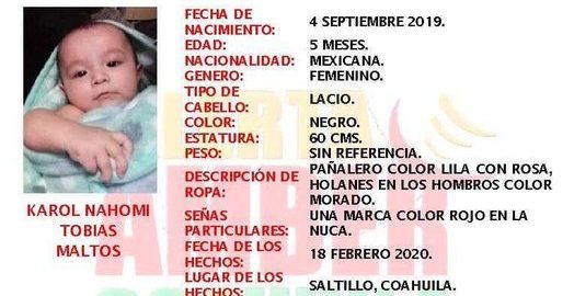 MÉXICO – En medio de un ambiente de conmoción e indignación por el asesinato de la niña Fátima, los mexicanos siguen padeciendo los crímenes contra menores ya que ahora fue hallada muerta Karol Nahomi, una bebé de cinco meses, que había sido reportada como robada en la ciudad de Saltillo, en el estado norteño de Coahuila.