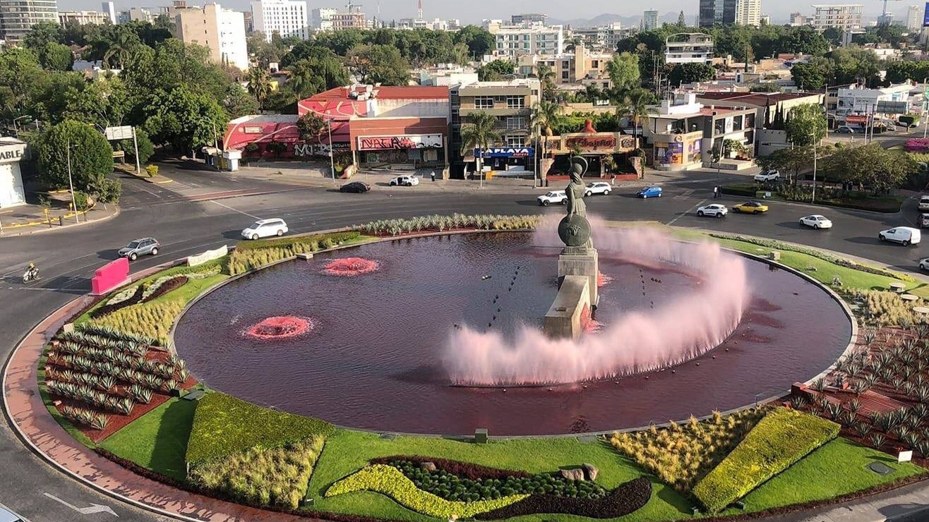 El agua de la fuente de uno de los emblemas arquitectónicos de la ciudad del estado de Jalisco en México amaneció de color rojo y en la rotonda, justo a un lado de la marca Guadalajara, Guadalajara, se colocó un letrero con la leyenda “México Feminicida”.
