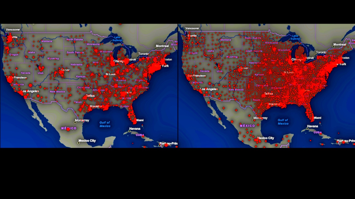 El mapa de la izquierda corresponde al 24 de marzo, cuando se habían reportado casi 55,000 casos y el número de muertos todavía no llegaba a 800.