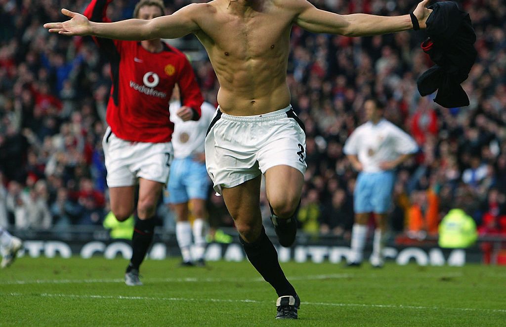 Diego Forlán celebrando un gol con Manchester United en el 2002. Crédito: Laurence Griffiths | Getty Images