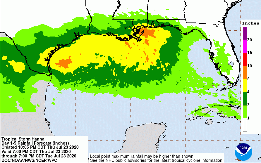 El gráfico muestra las lluvias asociadas a la tormenta tropical Hanna. Crédito: WPC/NOAA | Cortesía