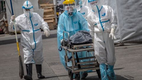 Personal médico con equipo de protección transporta el cadáver de un paciente con COVID-19 en Filipinas. Crédito: Getty Images