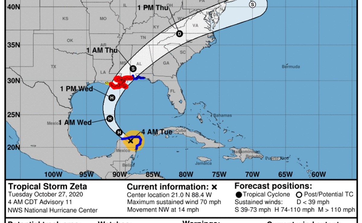 Storm Surge and Hurricane Warnings have been issued for a portion of the northern Gulf coast for #Zeta. Zeta is forecast to approach the northern Gulf coast as a hurricane on Wednesday. Follow the latest forecasts at: https://t.co/tW4KeGdBFb pic.twitter.com/Pq6lsxKdjJ