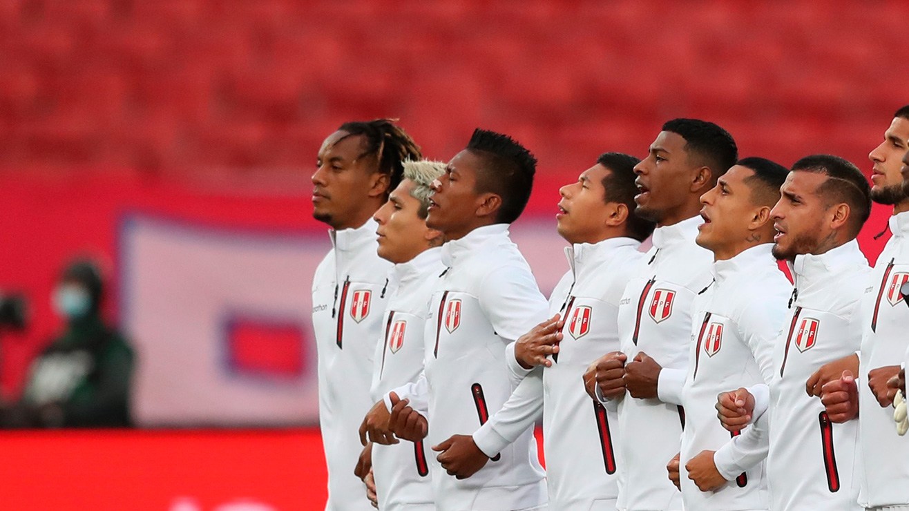 Los jugadores de Perú cantaron el himno nacional con los brazos entrelazados mostrando la unión que hay en medio de la crisis política que sufre el país.