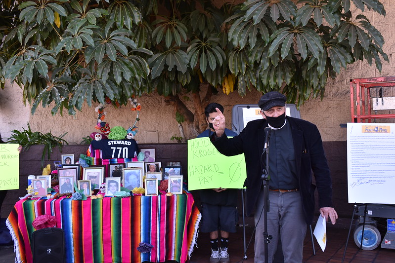 Frente a un altar de fotos de trabajadores esenciales fallecidos, empleados de los supermercados Food 4 Less y aliados pidieron a la compañía mayores protecciones de seguridad y pago extra por trabajar bajo condiciones peligrosas.
