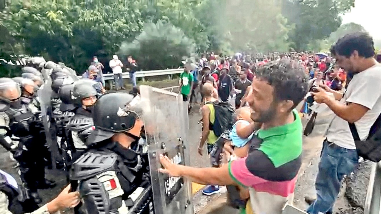 Con golpes y empujones, #migrantes que intentaban salir de #Tapachula, #Chiapas, fueron contenidos por elementos de la @GN_MEXICO_ y el @INAMI_mx; entre ellos había muchos niños. La #CaravanaMigrante se ha reducido pero avanza hacia #EstadosUnidos. #DDHH pic.twitter.com/43rLTdm9sZ