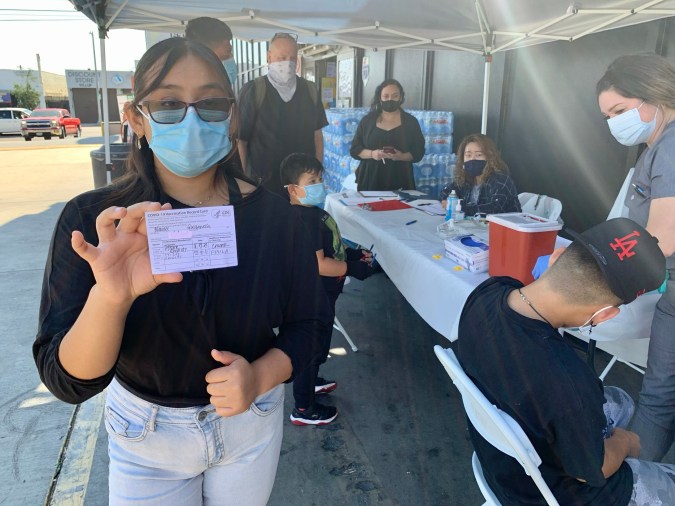 No muy convencido, Noé Morales llevó a su hija Guiannella de 13 años a vacunarse a la clínica móvil de vacunación contra covid-19 que se puso afuera del mercado Vallarta en el barrio de Boyle Heights de Los Ángeles.