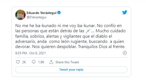 “No me he ba-kunado ni me voy ba-kunar. No confío en las personas que están detrás de las vacunas… Mucho cuidado familia, sobrios, alertas y vigilantes que el diablo el adversario, anda como león rugiente, buscando a quien devorar. Nos quieren despoblar. Tranquilos Dios al frente”, escribió el polémico actor.