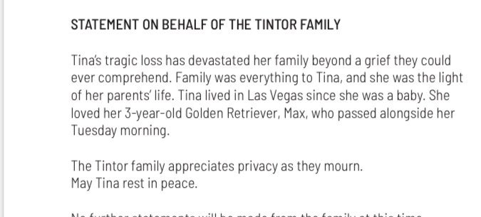 “La familia lo era todo para Tina, y ella era la luz de la vida de sus padres. Tina vivió en Las Vegas desde que era una bebé (…) Amaba a su golden retriever de tres años, Max”, dice la comunicación.