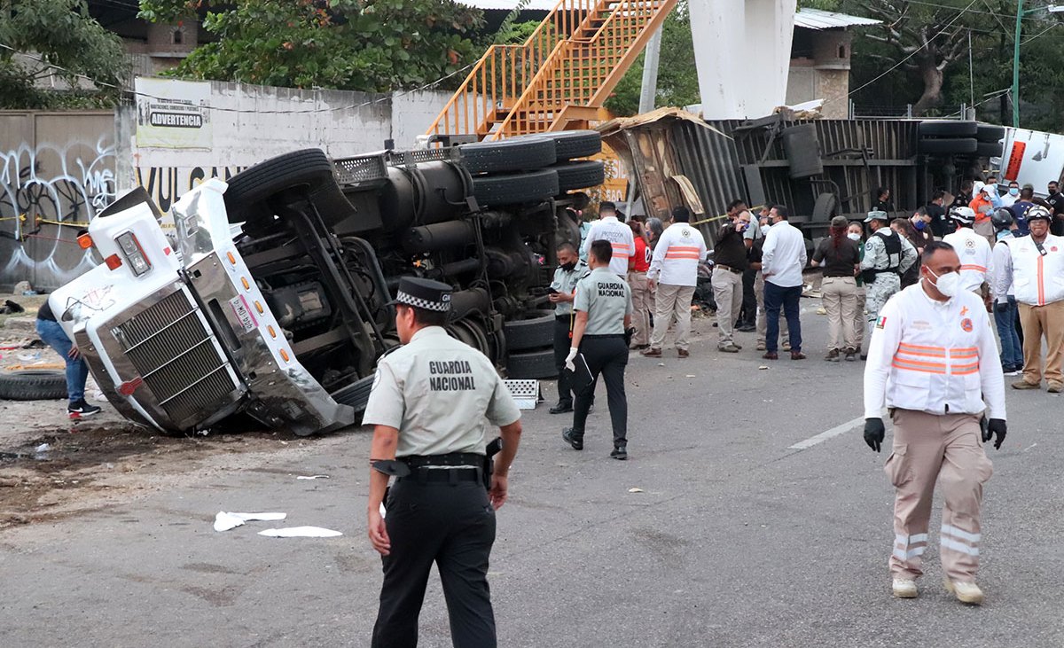 El tráiler donde viajaban los migrantes indocumentados chocó con la pared del muro de un puente peatonal, según el reporte de la Fiscalía de Chiapas.