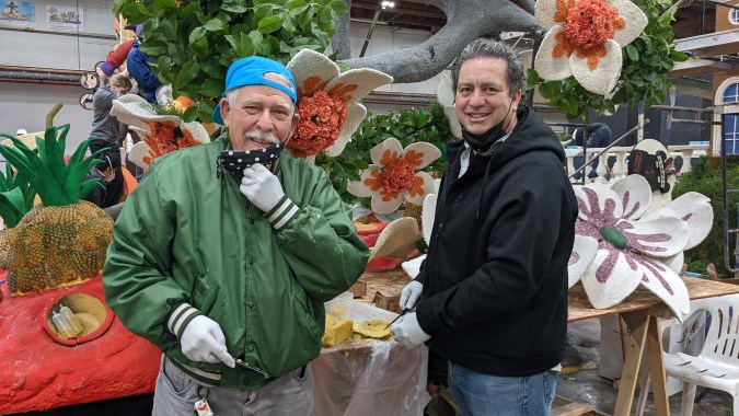 En la carroza de China Airlines un par de voluntarios, Ted Koupal y Greg Kendall, cortaban piñas para poner la cascara en la carroza y la fruta para los voluntarios que quisieran comerla.