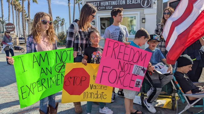 Durante la protesta de Huntington Beach una madre de familia dijo que ella no se opone a las vacunas requeridas en las escuelas ya que sus hijos de 13 y 10 años tienen todas menos la del covid-19. Ella cree que esta vacuna ha sido creada de forma muy rápida, sin suficientes pruebas y no vale la pena.