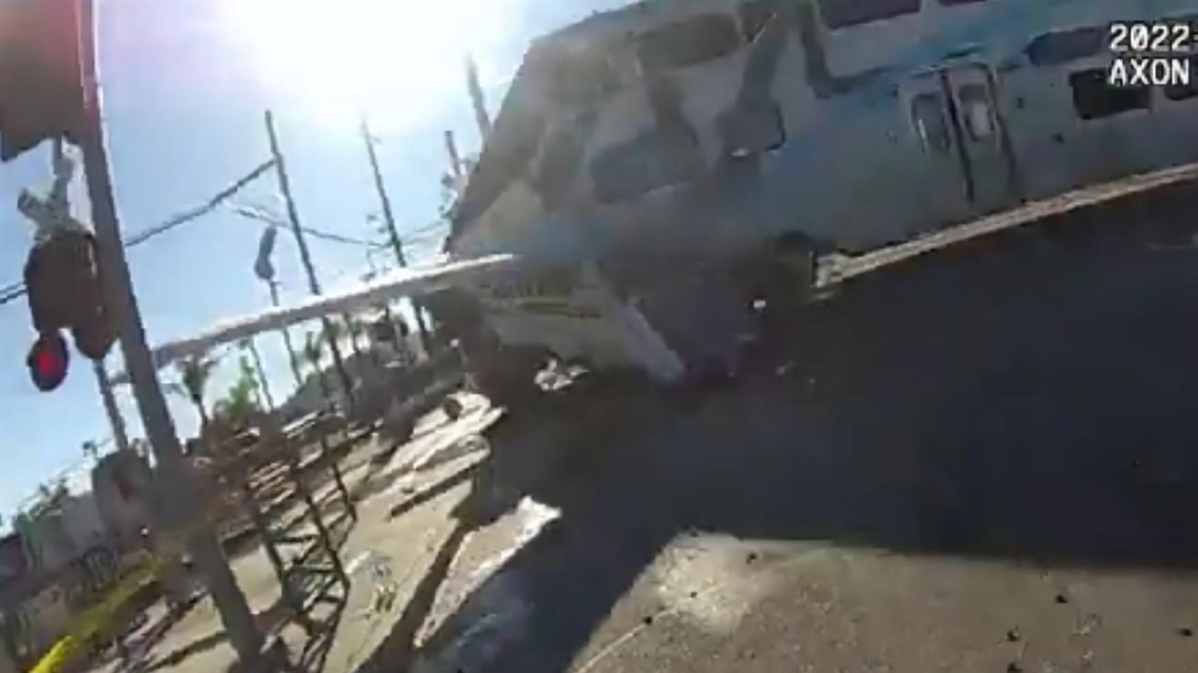 Una cámara corporal de un oficial captó el momento en que el piloto es rescatado y llevado a un lugar seguro cuando se observa el impacto del tren contra la aeronave.