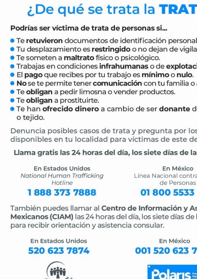 Así que invitó a quienes estén viviendo una situación que no parece normal o sospechan de otra persona que pueda ser víctima de trata, que acudan al Consulado de México en Los Ángeles.