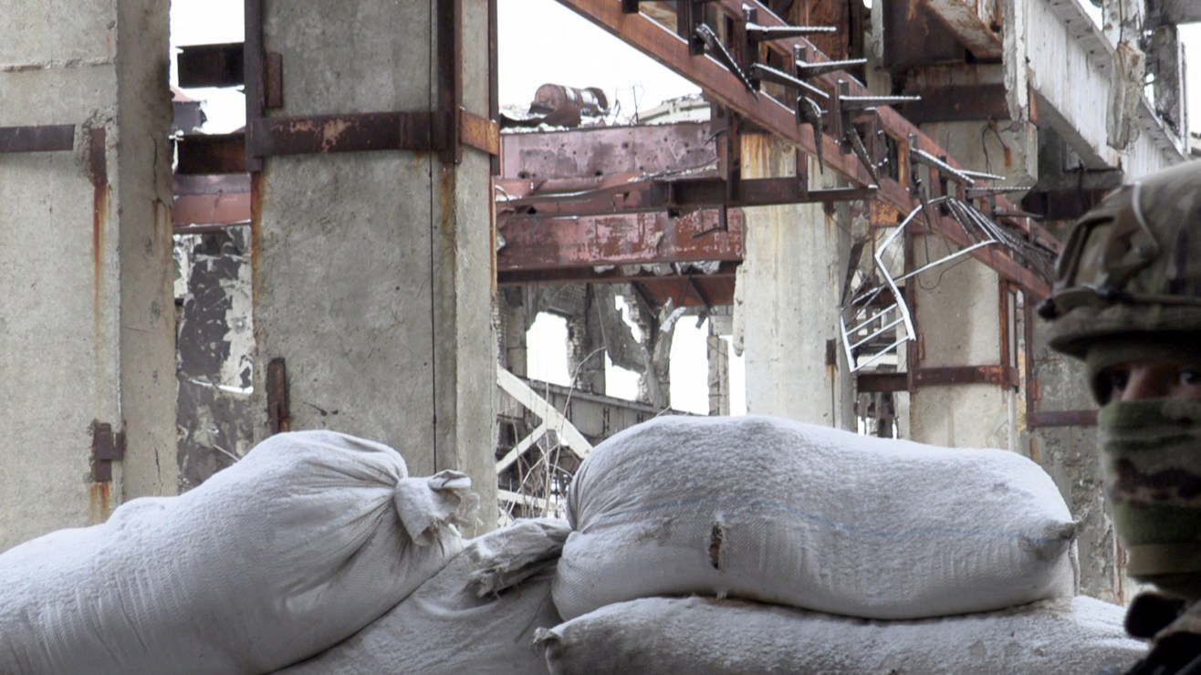 Un militar de Ucrania hace guardia en la zona industrial destruida en el frente con los separatistas respaldados por Rusia. Crédito: WILL VASSILOPOULOS | AFP / Getty Images