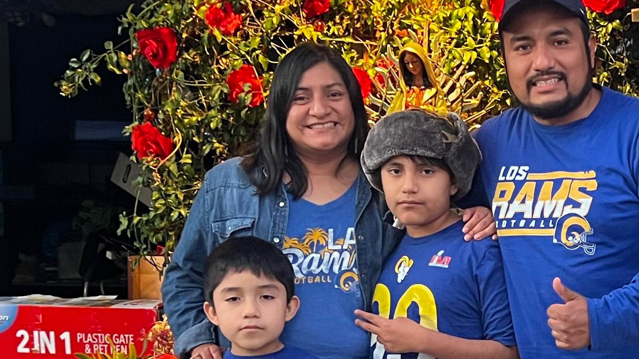 Con varias banderas de los Rams en su casa en Wilmington, Joe Piña se alistó para ver el Super Bowl desde horas antes con algunos familiares. Su opción pudo haber sido muy diferente, pero por amor a su familia, el aficionado se quedó en casa, mientras su esposa, hija y nieta vieron el juego en persona en el SoFi Stadium de Inglewood.