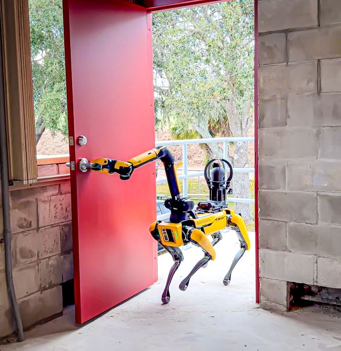 Spot, que se sumó al equipo de agentes del departamento gracias a la donación de un matrimonio de la ciudad, dispone de una cámara y un intercomunicador que permite a su operador hablar y escuchar a, por ejemplo, un “sospechoso atrincherado en un edificio o que tiene rehenes”.
