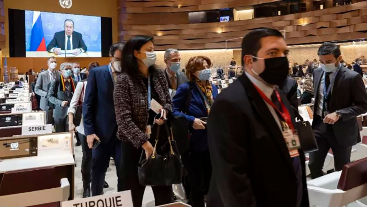 La mayoría de las delegaciones abandonaron la sala en protesta contra la invasión de Ucrania cuando comenzó a difundirse el mensaje pregrabado de Lavrov. Los enviados de Siria, China y Venezuela permanecieron.