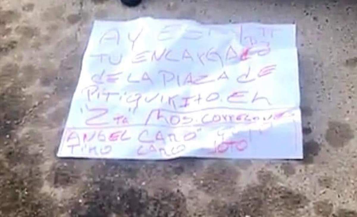 Sicarios dejan narcomensaje junto al cadáver, supuestamente la víctima era jefe de plaza de un grupo rival que intenta ganarles territorio