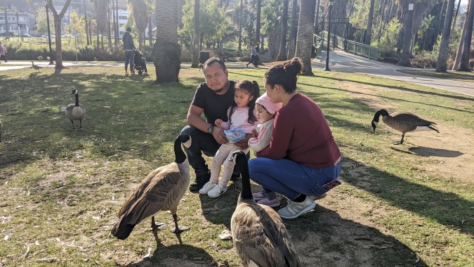 En ese ambiente de calma también estaba Luis Martínez, quien junto a su hermana Alicia Martínez, intentaban enseñarle a sus niñas cómo alimentar a los gansos.