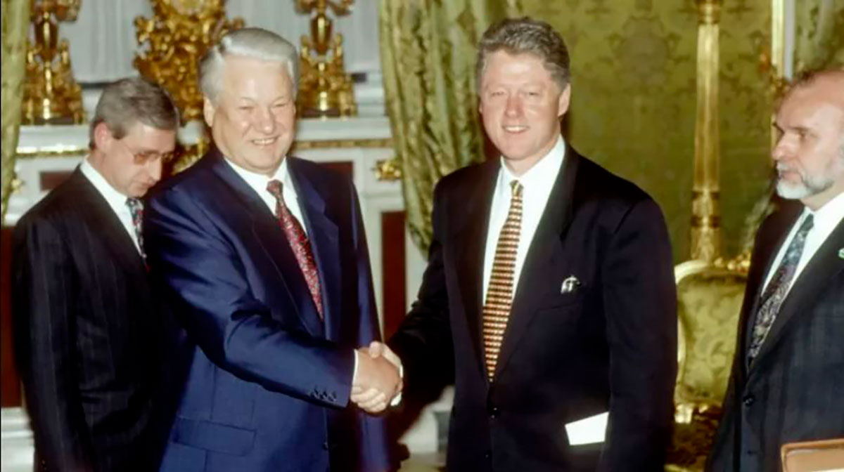 El entonces presidente de Estados Unidos, Bill Clinton, junto a su homólogo ruso, Boris Yeltsin, durante la primera visita oficial del estadounidense a Rusia. Crédito: Getty Images