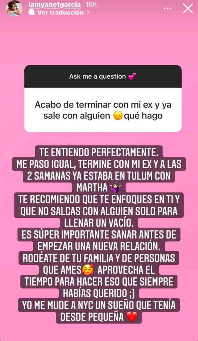 Tras revelar por primera vez lo que sucedió con su noviazgo, la también actriz se solidarizó con su seguidor y compartió algunos consejos que a ella le sirvieron para superar el doloroso momento, destacando que para sanar decidió enfocarse en ella misma y cumplir sus propios sueños, uno de los más importantes fue mudarse a Nueva York.
