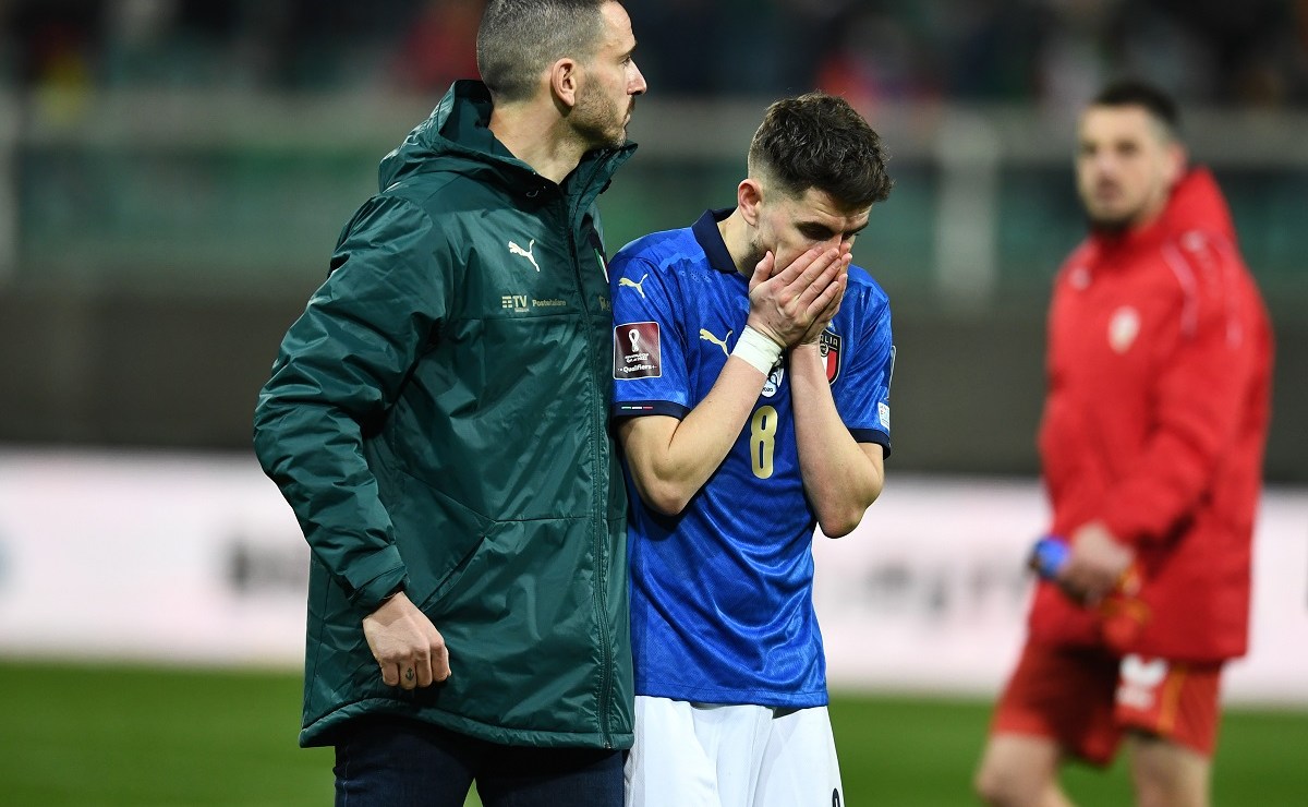 Leonardo Bonucci y Jorginho tras la eliminación de Italia frente a Macedonia del Norte. Crédito: Getty Images