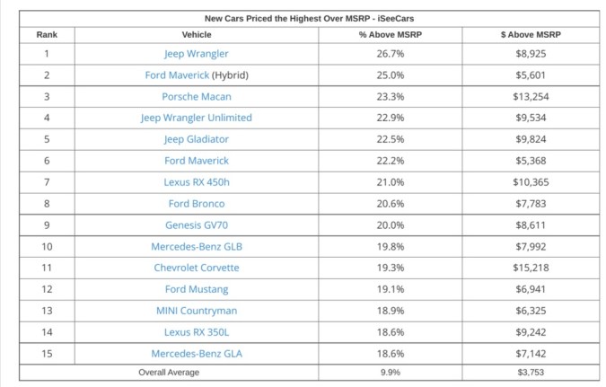 En este informe del portal, dedicado a seguir de cerca a las tiendas que están aumentando constantemente el precio de venta de cada uno de los vehículos, se puede apreciar cuáles son los modelos que tienen más probabilidades de ser vendidos por encima del precio recomendado al público (MSRP).