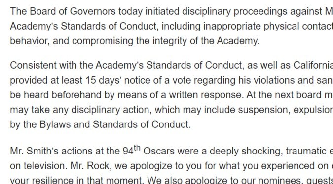 “Se le pidió al Sr. Smith salir de la ceremonia y él se negó, también reconocemos que pudimos manejar la situación de diferente manera“, se lee en un comunicado de la Academia.