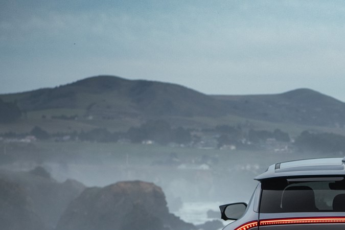 El Kia EV6 parece a simple vista más pequeño de lo que en realidad puede ser. La distancia entre ejes es de 114.2 pulgadas, similar a la del Kia Telluride. Tiene quemacocos solo sobre los asientos delanteros para reducir el peso del vehículo.