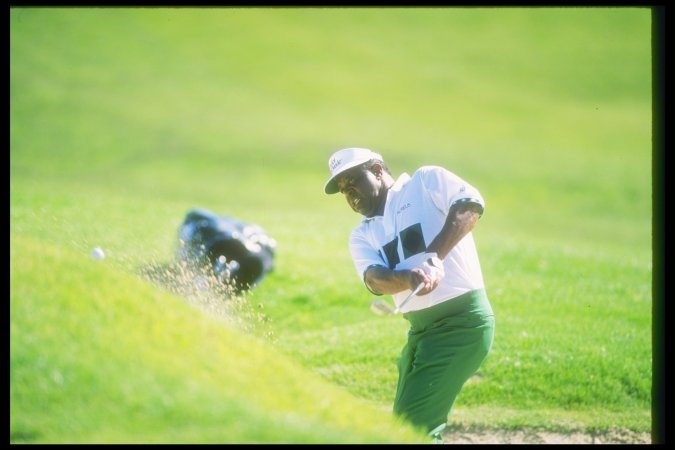 Lee Elder en un torneo, se vio obligado a cambiarse en el estacionamiento después de que se le negara la entrada a la casa club; durante otro, su pelota había sido arrojada a un seto por un espectador. Crédito: Andy Lyons/Allsport | Getty Images