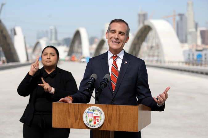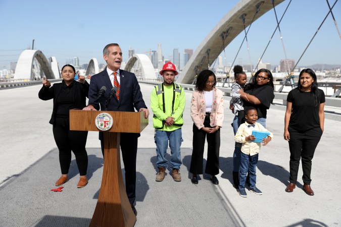 El alcalde Eric Garcetti dio su último informe de gobierno sobre el puente de la calle 6 en proceso de construcción. (Gary Coronado / Los Angeles Times)