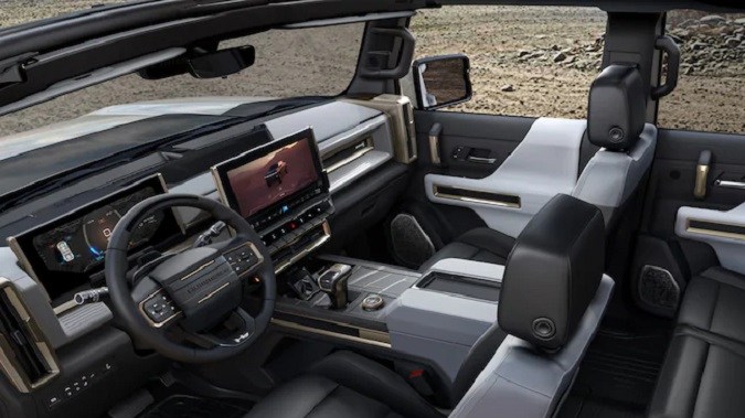 El techo y los laterales de la Hummer EV son desmontables en paneles que además se pueden almacenar en el maletero. Al hacerlo el auto queda en una configuración y aspecto muy distinto. Sigue siendo de enorme tamaño midiendo 5.51 metros de largo por 2.20 de ancho y 2.06 de altura con un peso superior a los 4,000 kilos.