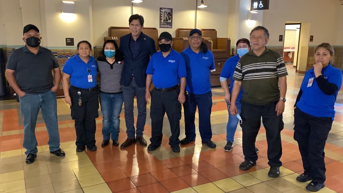 Líderes del sindicato SEIU-USWW, que representa a los conserjes, en su mayoría inmigrantes latinos y latinas, que limpian y desinfectan Union Station, y continúan en la primera línea de trabajo de la pandemia, enviaron una carta a varios funcionarios electos como el concejal Kevin de León, la senadora María Elena Durazo y la supervisora Hilda Solís.
