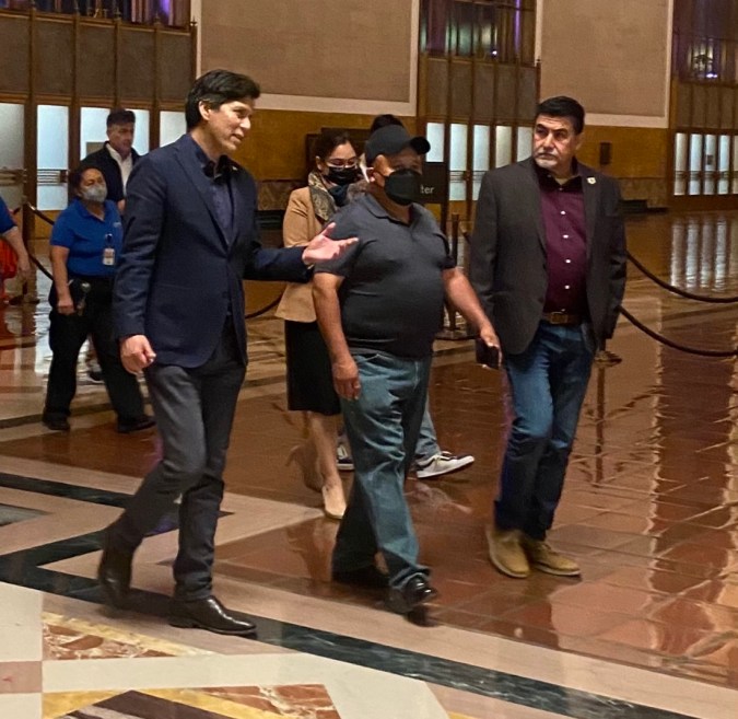 El concejal Kevin de León y David Huerta, líder sindical junto con el conserje Gerardo Mixcoatl recorren Union Station. (Cortesía) Crédito: Cortesía