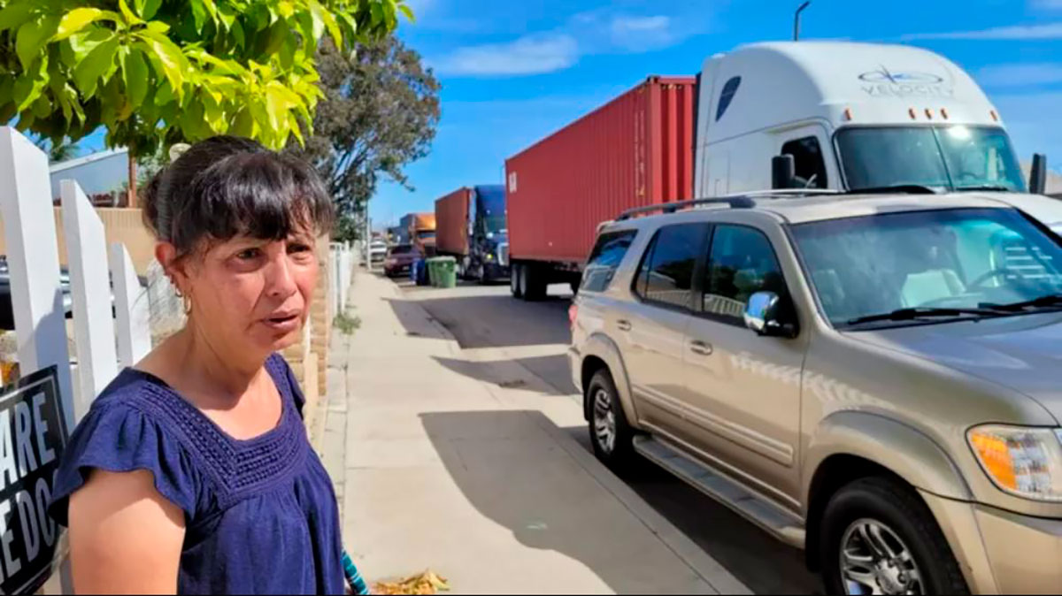 Imelda Ulloa en la puerta de su casa en Wilmington frente a la constante fila de camiones. Crédito: ANALÍA LLORENTE | copyright