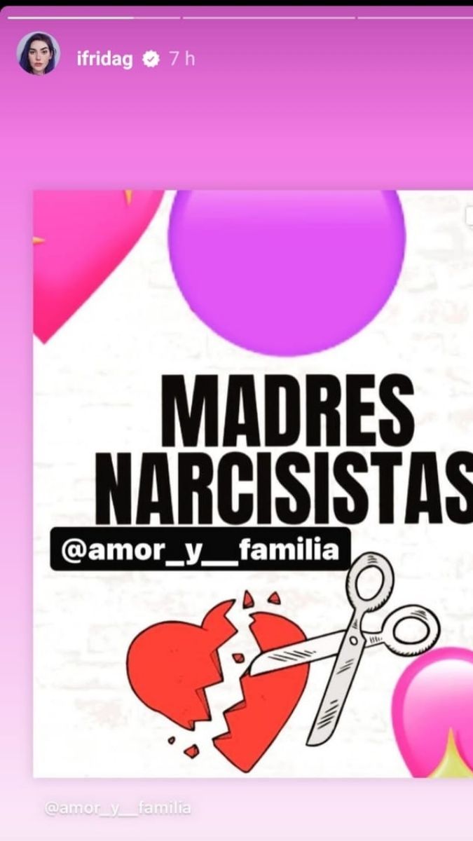 Por medio de su cuenta de Instagram, la hija de Alejandra Guzmán y Pablo Moctezuma replicó un post en el que fue etiquetada de la cuenta Amor y Familia en la que se dan detalles de “Madres narcisistas”. Sus seguidores han indicado que esta publicación va dirigida hacia la cantante de ‘Yo te esperaba’ y ‘Día de suerte’, a quien ha acusado de ser una mamá ausente.