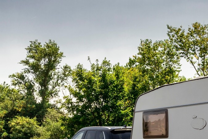 Un auto circula en la vía con un remolque. Crédito: Shutterstock