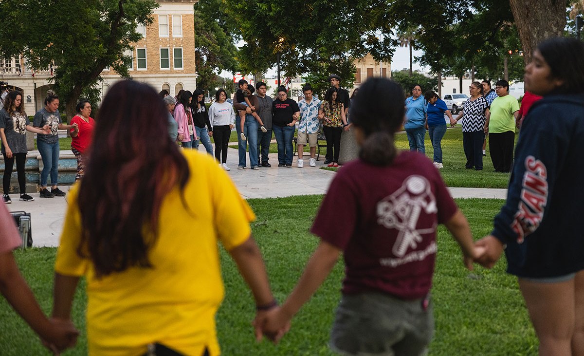 Niños y adultos realizan oraciones por fallecidos en el tiroteo en escuela de Uvalde, Texas. Crédito: Jordan Vonderhaar | Getty Images