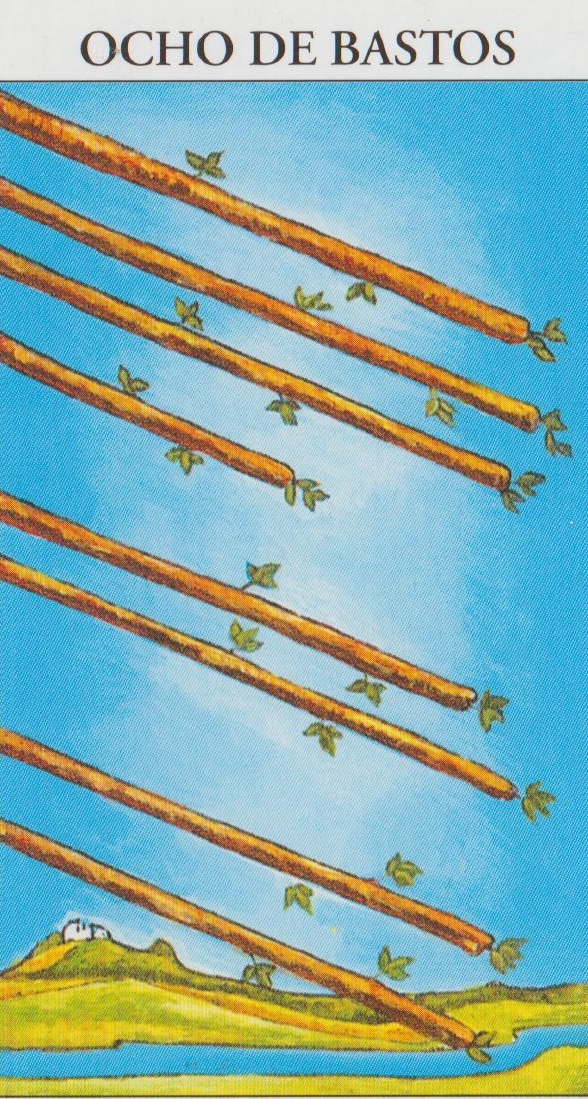 2. Ocho de Bastos: No tomes decisiones apresuradas, tomate tu tiempo, no permitas que nadie te presione por una respuesta que necesita respuesta casi inmediata, tomate tu tiempo, Es una semana en donde la precipitación te puede llevar a una confusión, a un caos que nadie parara. Actúa de manera justa, recuerda que ahí estará tu ventaja esta semana, eres un ser justo y respetuoso de los demás. Podrás sentir como todo sufre un cambio profundo, el amor, tus sentimientos, tus metas, tus sueños, pero es un cambio para bien, un cambio en el que primero veas todo revuelto, pero conforme pase la semana podrás ir poniendo todo en su lugar. Déjate llevar por ese renacimiento que tanto anhelaba tu cuerpo, tu alma. Encontraras tu camino en las uniones, desde la unión con lo divino, hasta en la unión con esa persona que amas. No descuides el ejercicio ni la dieta, hasta ahora seguirás gozando de un excelente estado físico, pero este también depende mucho de mantener las emociones en perfecto equilibrio, así que a estos dos aspectos en tu vida les tienes que dar la misma importancia.