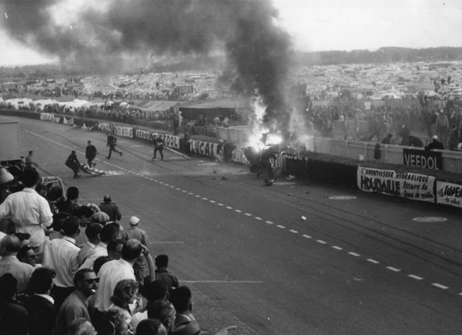 El 11 de junio de 1955, un auto de carreras en Le Mans, Francia, perdió el control y chocó contra las gradas llenas de espectadores, matando a 82 personas. La tragedia en la famosa carrera de 24 horas llevó a la prohibición de las carreras en varias naciones.
