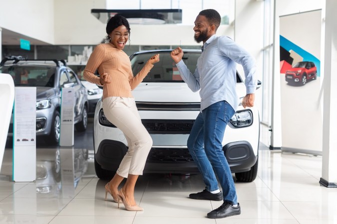Chica no se decide entre un auto blanco y otro negro. Crédito: Shutterstock